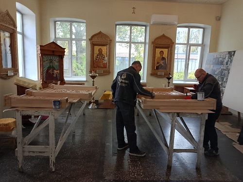 Теперь подошла очередь соответствующего обустройства клироса в одном стиле с иконостасом. Проект дорогостоящий, но главное, выполняют его мастера художественной резки по дереву, известные высоким качеством работ.