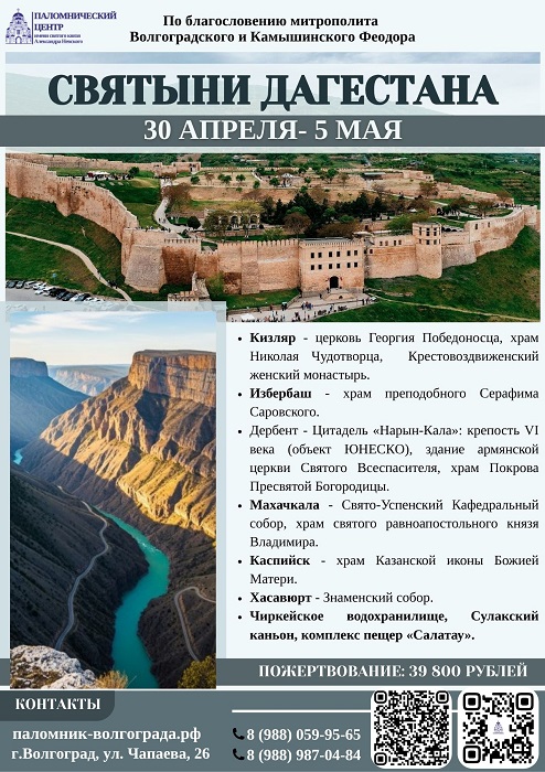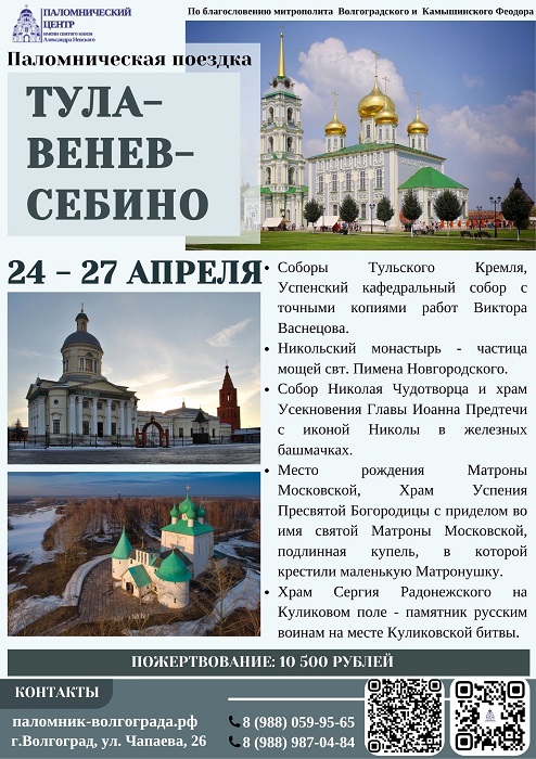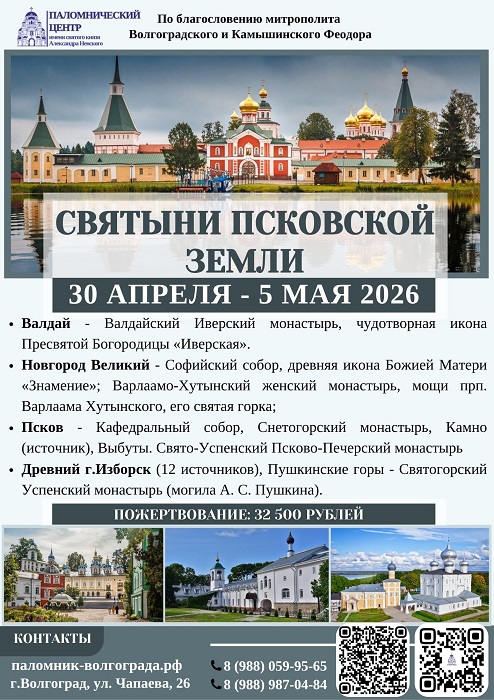К святыням России — в апреле Опубликовано 18.04.2026 paraskeva-press Паломнический центр Волгоградской епархии предлагает в ближайшие дни следующие маршруты поездок к святыням России. Телефоны Центра — на афишах Понравился материал?ПоделитьсяВКонтактеОдноклассникиTwitterМой МирGoogleTumblr