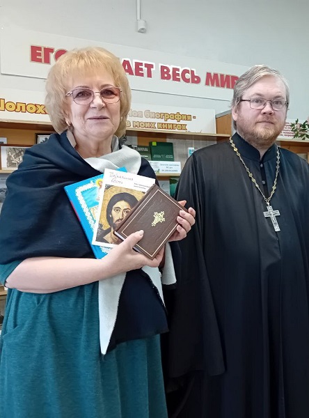 В рамках Дня православной книги, иерей Виктор Иващенко преподнёс в дар библиотеке имени М.А. Шолохова Детскую Библию, издания Нового Завета, и книгу Азы Православия.