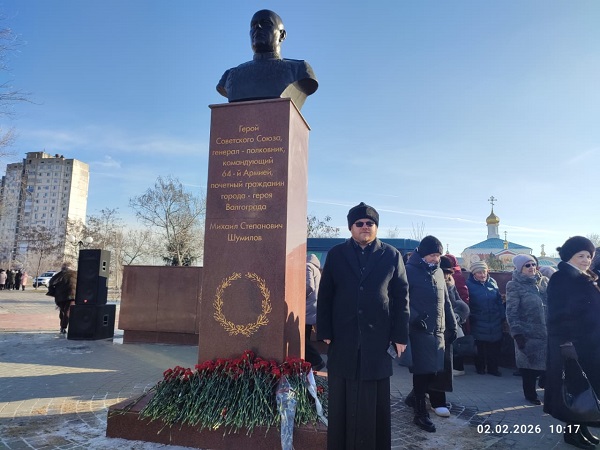 Сегодня в Сквере Доблести и Славы у памятника командующему 64-й Армией генерал-полковнику Михаилу Степановичу Шумилову прошла торжественная акция, посвященная 83-й годовщине победы в легендарной Сталинградской битве.