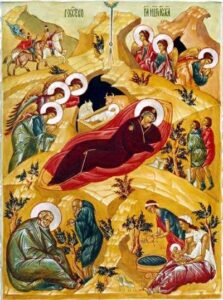 Из-за множества людей для Марии и Иосифа не осталось места в гостинице, и остановиться на ночлег им пришлось за городом в убогой пещере, куда в ненастную погоду пастухи загоняли скот. Глубокой ночью в этой пещере родился Богомладенец Иисус Христос. Пресвятая Богородица спеленала Его и положила в ясли — кормушку для скота.