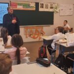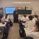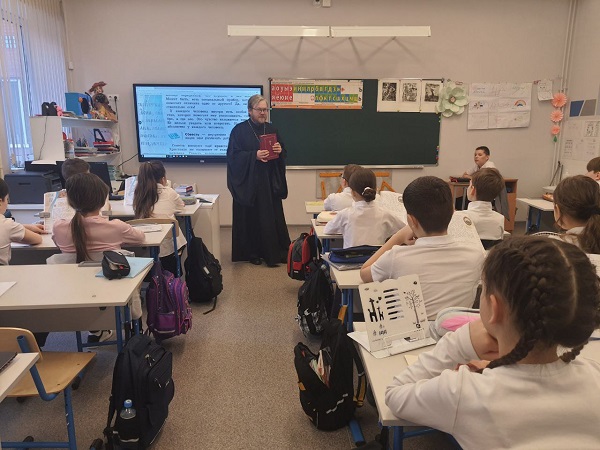 В средней школе № 77 о. Виктор свой урок в 4-д классе назвал «Читаю с папой», постаравшись донести до младших школьников наиболее важное из того, что содержит Библия.