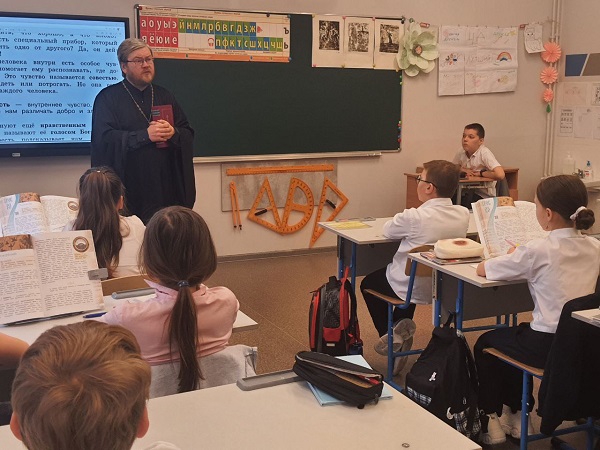 Открытые уроки в рамках Дня православной книги настоятель прихода Святой Троицы иерей Виктор Иващенко провёл в нескольких общеобразовательных учреждениях Кировского района.