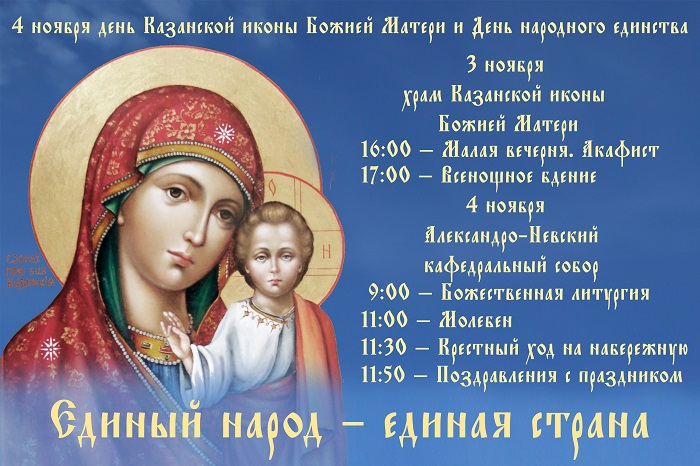 4 ноября Церковь совершает празднование Казанской иконе Божией Матери в честь избавления Москвы и России от польской интервенции в 1612 году. Теперь это и государственный праздник – День народного единства.