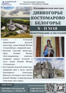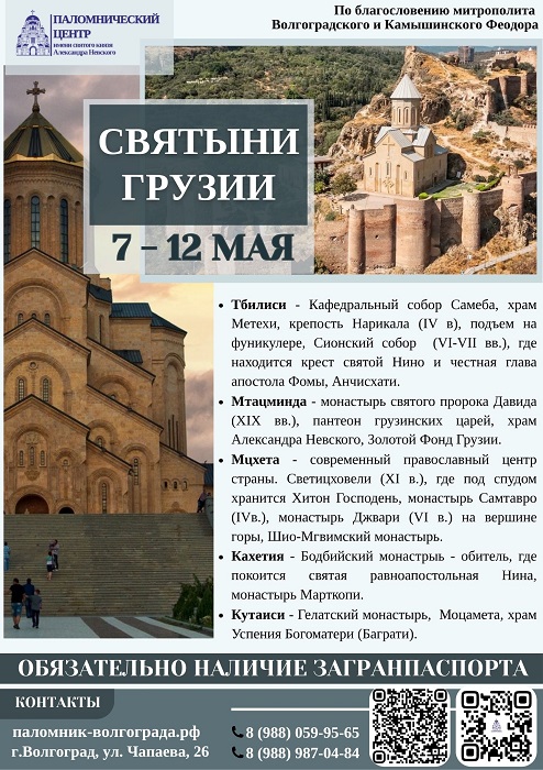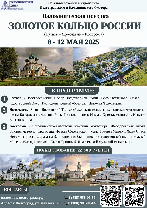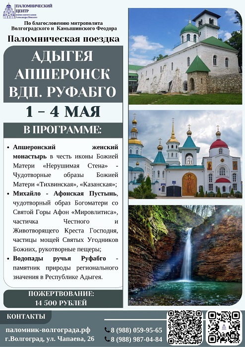Собираемся в паломничество Опубликовано 28.04.2026 paraskeva-press В первой воловине мая вас ожидают поездки, которые наполнят душу и сердце незабываемыми духовными переживаниями, новыми открытиями и впечатлениями. Волгоградская епархия, паломнический центр: 8 988 059 95 65 , 8 988 987 04 84 Понравился материал?ПоделитьсяВКонтактеОдноклассникиTwitterМой МирGoogleTumblr