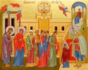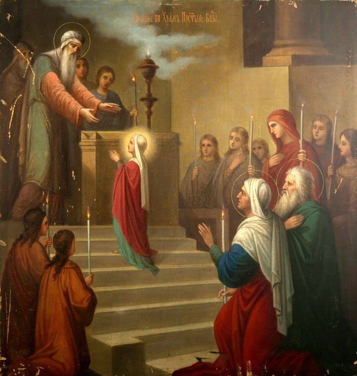 Когда Марии исполнилось три года, праведные Иоаким и Анна, во исполнение своего обета, одели дочь в лучшие одежды и в сопровождении родственников и её сверстниц, таких же маленьких девочек, с зажжёнными свечами торжественно привели её в Иерусалимский храм.